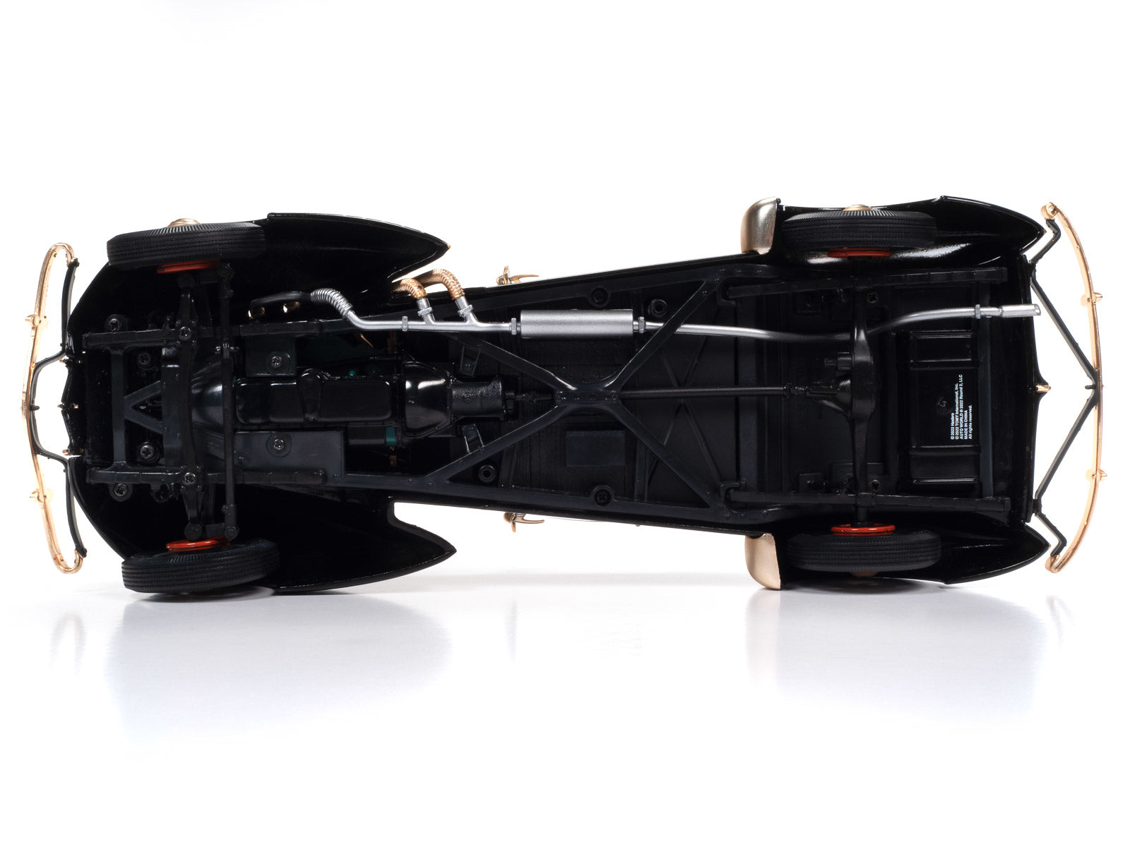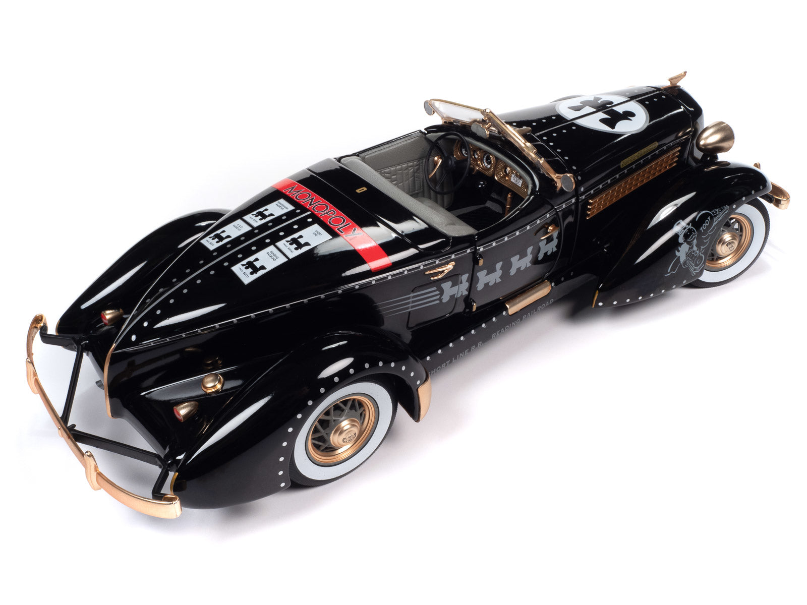 From Round 2. Embrace the spirit of a railroad tycoon with the Auto World 1:18 scale die-cast replica of the coal-black 851 Speedster, featuring Monopoly graphics. This highly collectible model showcases sweeping lines, a supercharged Lycoming eight-cylinder engine, and a distinctive boattail rear end. It includes a detailed engine, steerable front wheels, an accurate interior and chassis, and opening doors and hood. Additionally, a resin figure of Mr. Monopoly proudly posing on a railroad engine token is included, making it a perfect addition for any Monopoly enthusiast.