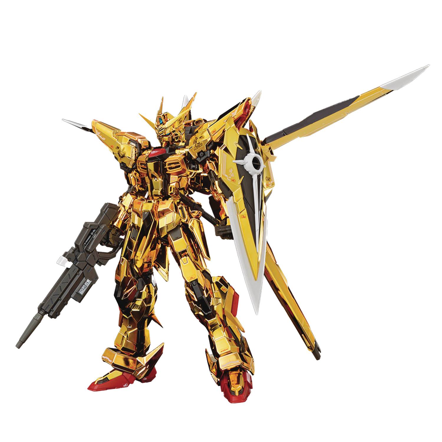 From Bandai Hobby. The Akatsuki Gundam from "Mobile Suit Gundam Seed Destiny," equipped with the Oowashi Pack, is plated in three types of gold and released as an RG (Real Grade) model kit by Bandai! The multi-faceted shape of the Gundam makes the entire body shine, and the angle of light reflection is adjusted to express the glittering coating of the Yata no Kagami. The nose, hatch, beam cannon, and more of the Oowashi Pack can be deployed; both wings can also move flexibly. This kit uses some of the frame parts of the RG Strike Gundam to achieve a high level of action. The shoulders have a pull-out mechanism to expand their range of motion, and the hip joints can also be opened widely for bold poses. A swing gimmick is equipped to the torso, and a sliding gimmick is on the arm and leg armor to allow for easy movement. The verniers on top of the shoulders and on the sides of the legs are also movable. Decals are included for its markings.